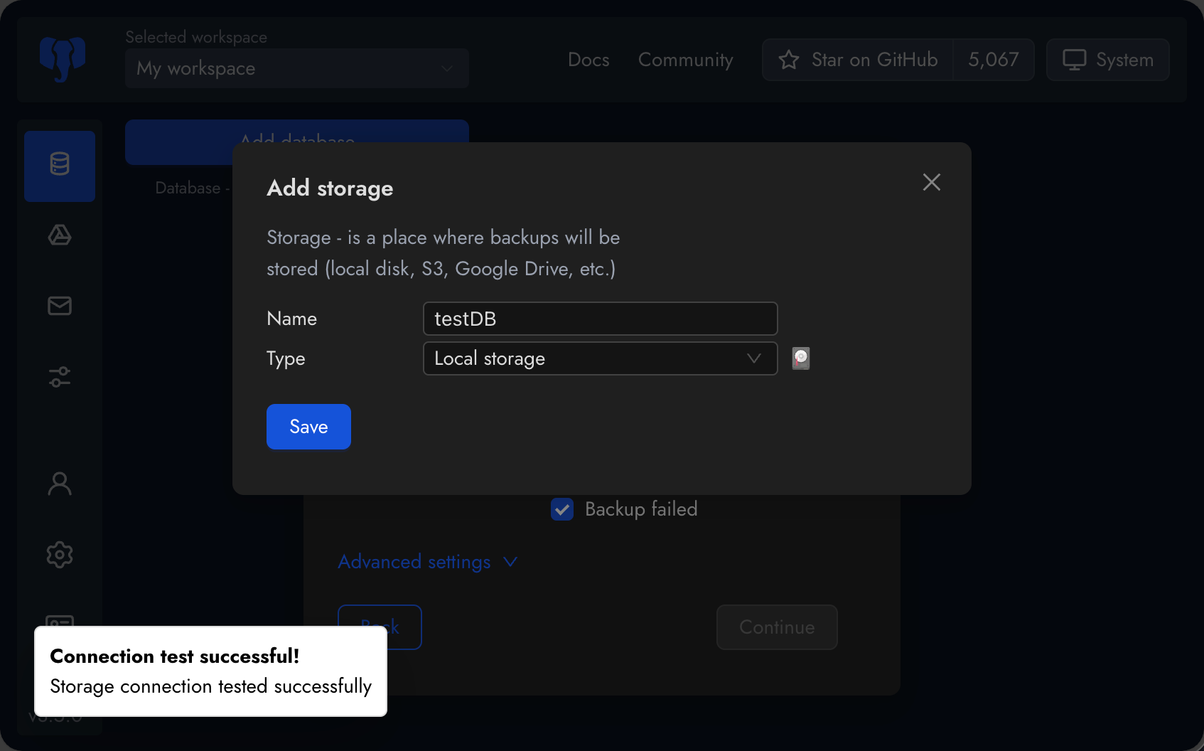 完成与验证: 填写完上述信息后,点击 “Save”。Databasus 会立即验证信息的准确性,启动计划任务并执行首次备份任务,你可以在界面上实时查看任务状态。备份完成后,支持一键恢复功能。